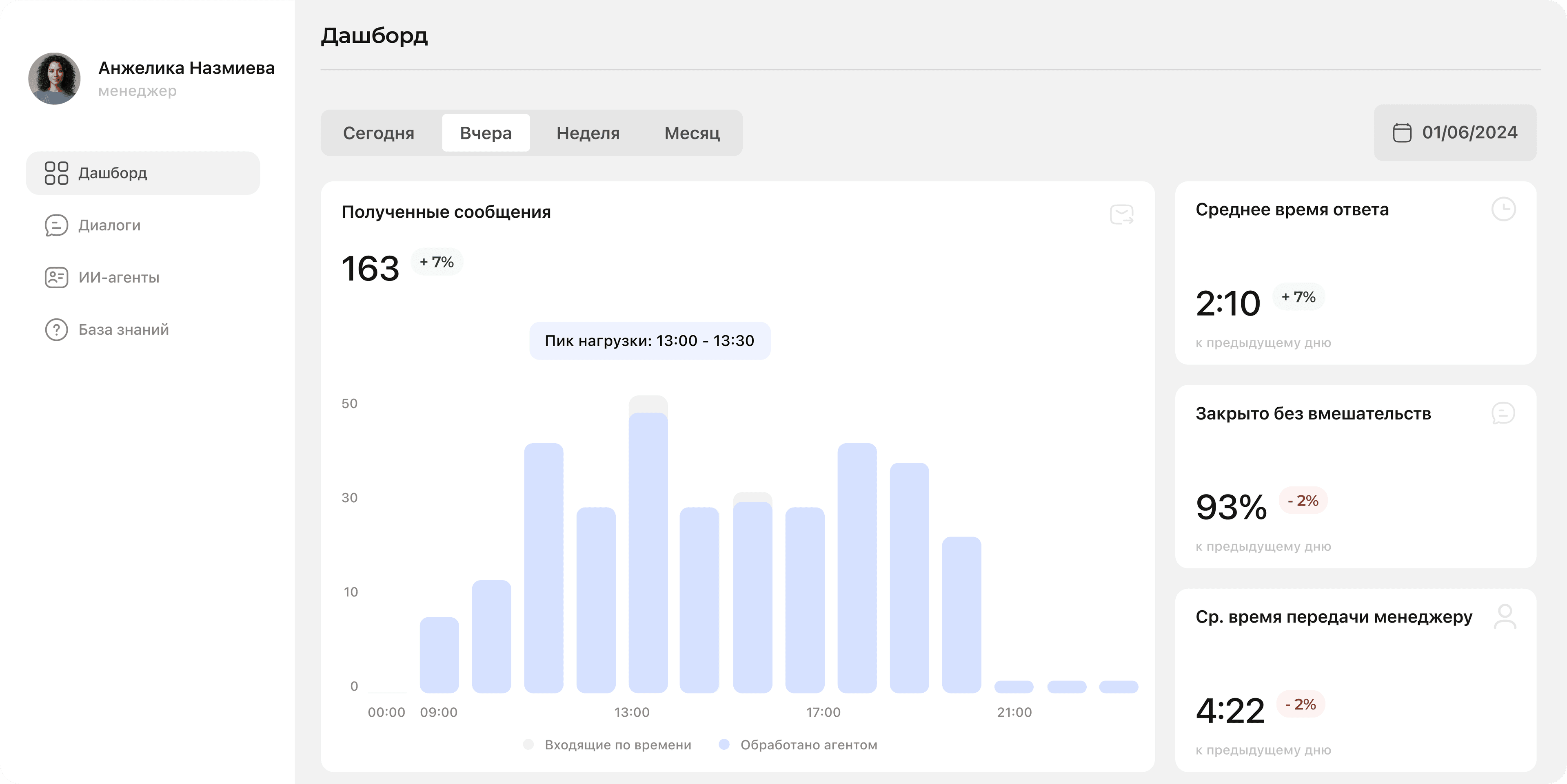 Создан удобный дашборд мониторинга входящих сообщений, упростивший контроль нагрузки и состояния диалогов.
